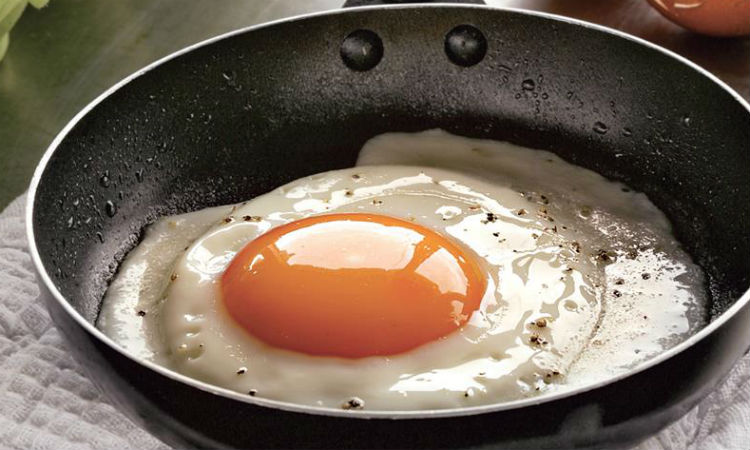Ждем когда поверхность белков станет мутнеть, после этого снимаем яйца со сковородки.